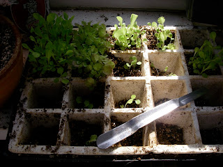 With the weather too chilly to start seeds outside, we turn to the greenhouse to jump start the garden. Here Dahlia has sown lettuce seeds thickly, and then transplants to one or two per pot when the first true leaves appear. This technique is useful when working with older seeds of uncertain viability. The little transplanting tool shown is perfect for moving delicate seedlings. The key to success in transplanting is to use a gentle hand!